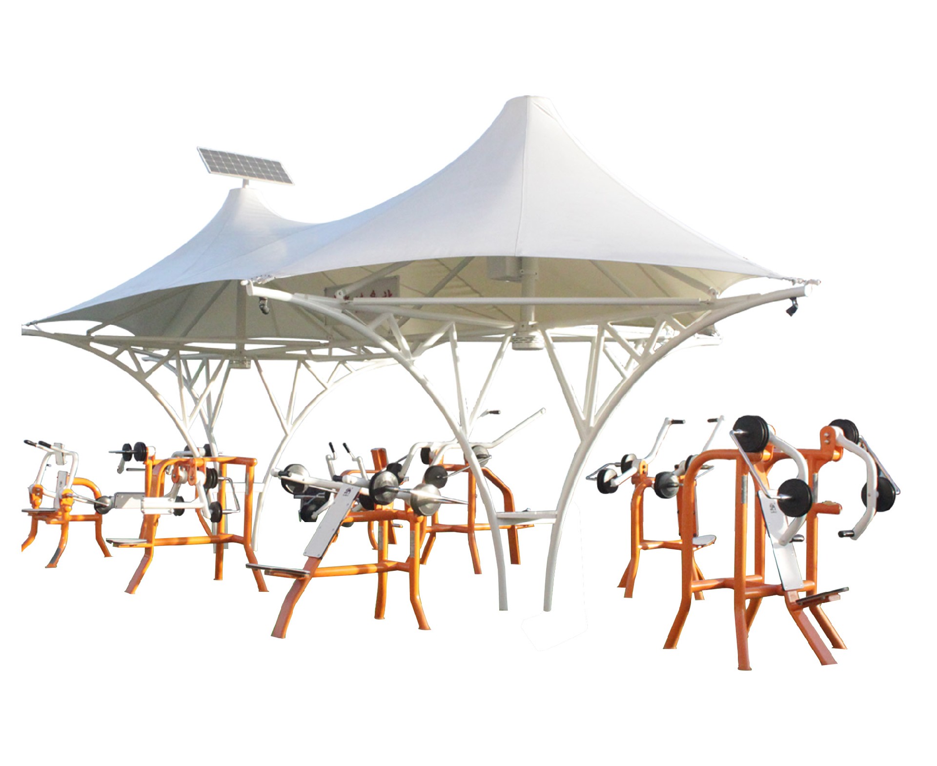 ◆ 器材主承载立柱采用4跟140×140×t3mm优质钢管🫅🏽,主立柱采用插入式木塑装饰板和铝型材复合结构🔈,器材上端采用PE滚塑拉模8角伞面🍥,顶端配置150W太阳能供电系统🫷🏿,搭载蓝牙音响🟤、USB充电插座和4盏LED白光灯👃🏽;器材底端铺设5.5米直径的防腐木地板,立柱周围安放6只木塑座椅可供老年人休闲娱乐,器材各部位螺栓、弹垫等紧固件均采用不锈钢材质🖖🏼,且具有可靠的防松🧘🏽、防盗措施👻。